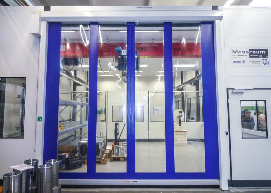Eine spezielle Lösung ist die freie Einfahrt des Hallenkrans in den Messraum. Selbst der Transport von Schwergewichten wird damit spielend einfach: Schiebe- bzw. Schwenktor öffnen, Decke auffahren, und der Weg ist frei. Ohne Umladen. Ohne Zeitverlust. Die Steuerung erfolgt zentral vom Messraum aus. So dirigieren Sie jedes Messstück sicher auf den Messtisch und zurück.