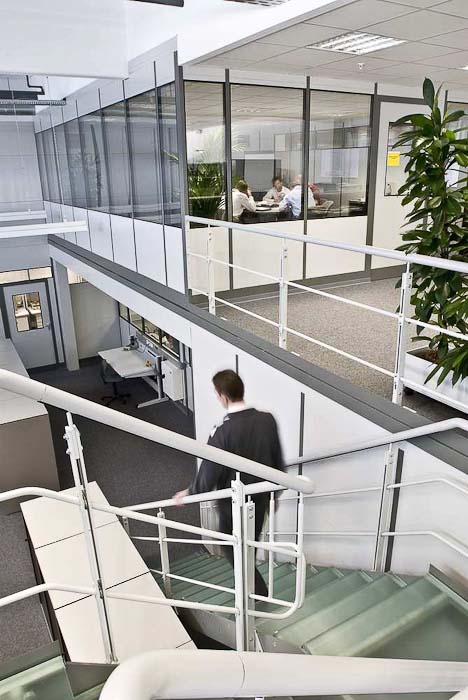 Zweigeschossige Büroanlage mit Treppe, Laufsteg und Geländer.