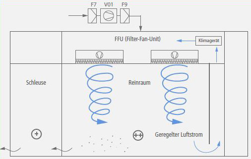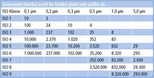 Im Reinraum nach DIN EN ISO 14644-1 werden luftgetragene Partikel bis 5μm überwacht. Die Reinheit wird in ISO-Klassen von 1-9 eingeteilt.